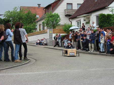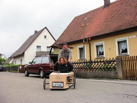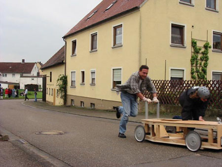 Getreu dem Motto "beim nächsten Mal wird alles besser" hat sich Robert diese originelle Seifenkiste ausgedacht. Keine Frage, das Nummernschild vorne dran verdeutlicht ziemlich gut seine Vorliebe zu Leichenwagen! Für 2003 ist eine Modifizierung dieser Kiste angedacht, und wir werden wieder daran teilnehmen!